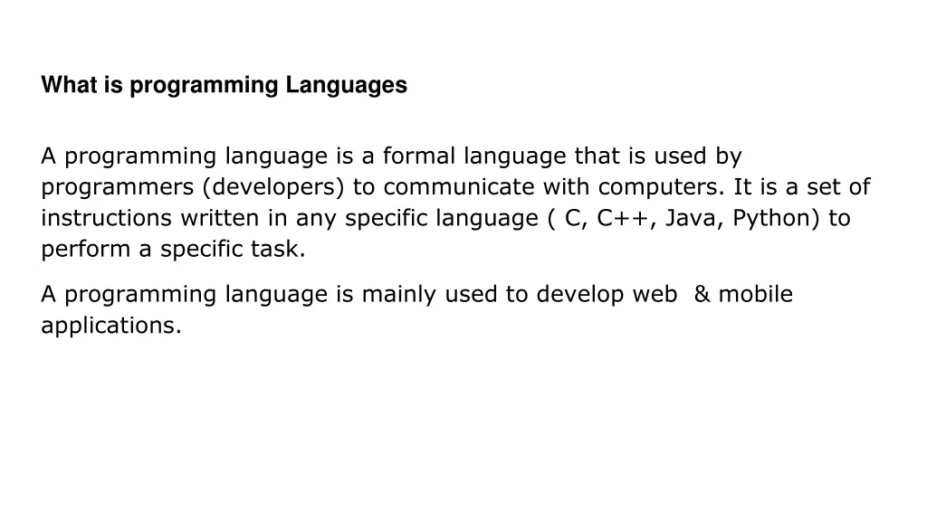 What is programming Languages A programming language is a formal language that is used by programmers (developers) to communicate with computers. It is a set of instructions written in any specific language ( C, C++, Java, Python) to perform a specific task. A programming language is mainly used to develop web & mobile applications.