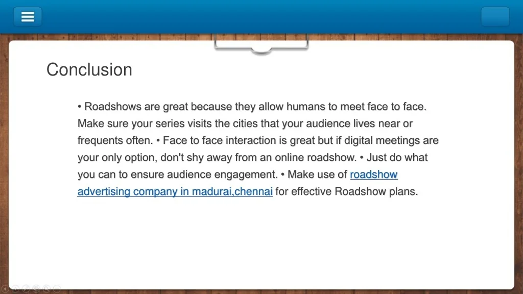 Conclusion • Roadshows are great because they allow humans to meet face to face. Make sure your series visits the cities that your audience lives near or frequents often. • Face to face interaction is great but if digital meetings are your only option, don't shy away from an online roadshow. • Just do what you can to ensure audience engagement. • Make use of roadshow advertising company in madurai,chennaifor effective Roadshow plans.