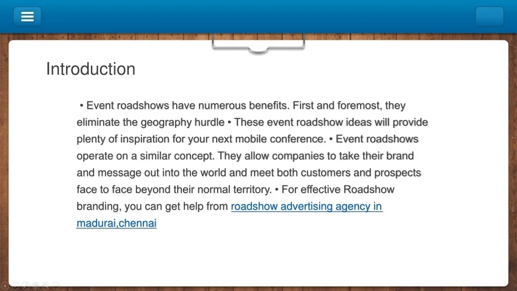 Introduction • Event roadshows have numerous benefits. First and foremost, they eliminate the geography hurdle • These event roadshow ideas will provide plenty of inspiration for your next mobile conference. • Event roadshows operate on a similar concept. They allow companies to take their brand and message out into the world and meet both customers and prospects face to face beyond their normal territory. • For effective Roadshow branding, you can get help from roadshow advertising agency in madurai,chennai