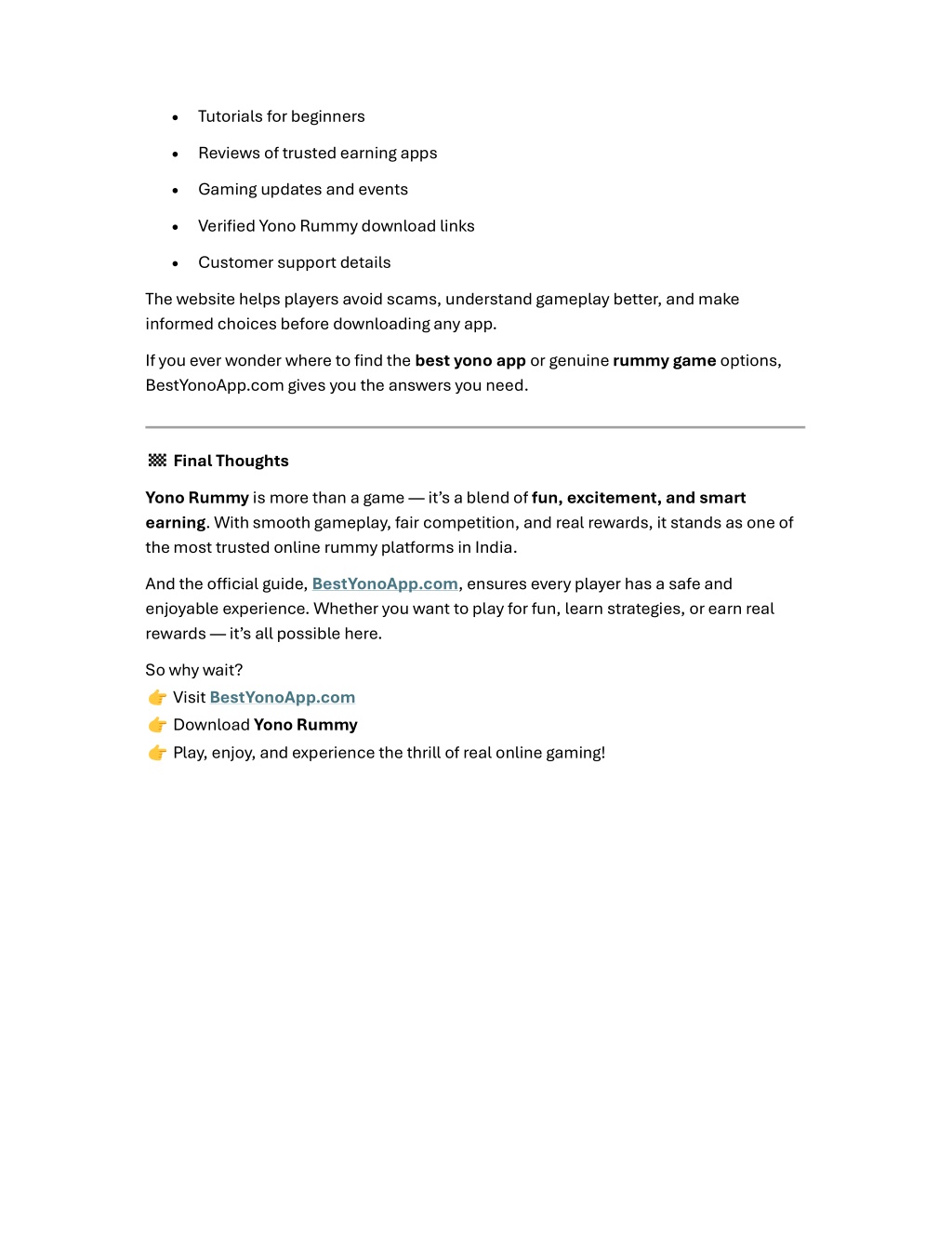 5. Tutorials for beginners Reviews of trusted earning apps Gaming updates and events Verified Yono Rummy download links Customer support details The website helps players avoid scams, understand gameplay better, and make informed choices before downloading any app. If you ever wonder where to find the best yono app or genuine rummy game options, BestYonoApp.com gives you the answers you need. ? ? ? ? ? ? Final Thoughts Yono Rummy is more than a game — it’s a blend of fun, excitement, and smart earning. With smooth gameplay, fair competition, and real rewards, it stands as one of the most trusted online rummy platforms in India. And the o?icial guide, BestYonoApp.com, ensures every player has a safe and enjoyable experience. Whether you want to play for fun, learn strategies, or earn real rewards — it’s all possible here. So why wait? ? Visit BestYonoApp.com ? Download Yono Rummy ? Play, enjoy, and experience the thrill of real online gaming! ? ? ? ? ? ? ? ? ?