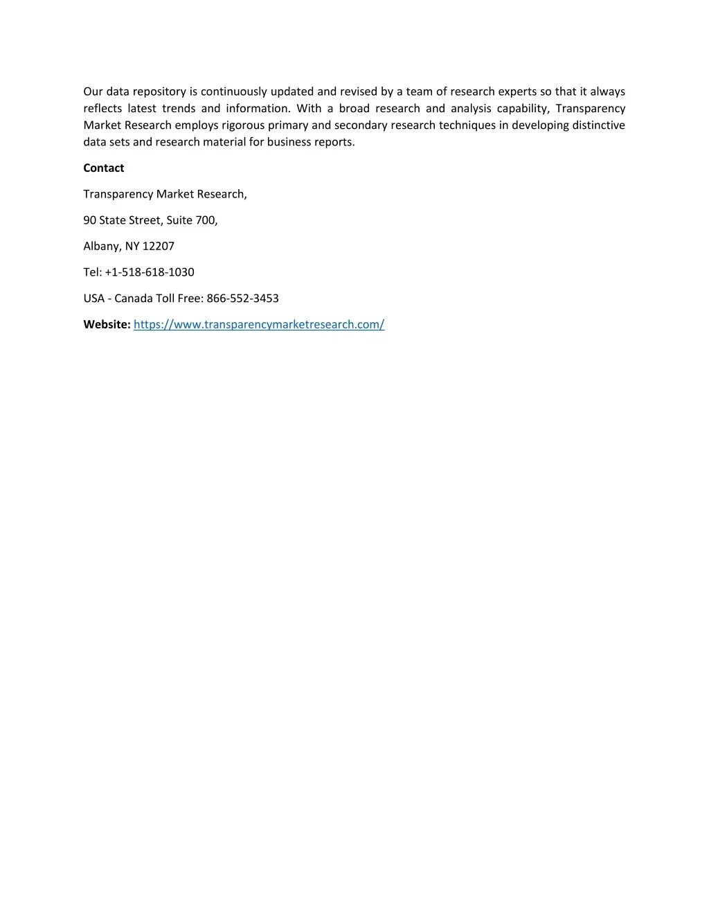 Our data repository is continuously updated and revised by a team of research experts so that it always reflects latest trends and information. With a broad research and analysis capability, Transparency Market Research employs rigorous primary and secondary research techniques in developing distinctive data sets and research material for business reports. Contact Transparency Market Research, 90 State Street, Suite 700, Albany, NY 12207 Tel: +1-518-618-1030 USA - Canada Toll Free: 866-552-3453 Website: https://www.transparencymarketresearch.com/