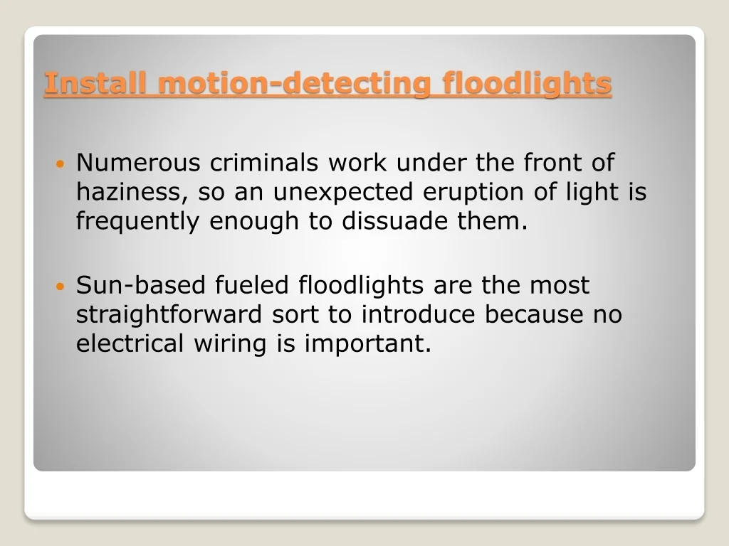 Numerous criminals work under the front of haziness, so an unexpected eruption of light is frequently enough to dissuade them. • Sun-based fueled floodlights are the most straightforward sort to introduce because no electrical wiring is important. Install motion-detecting floodlights