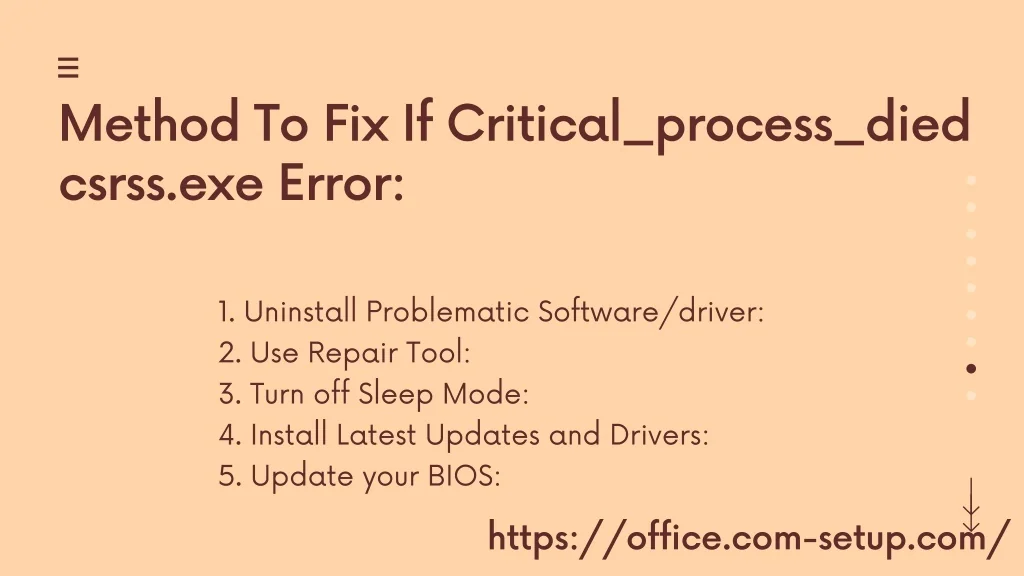 MethodToFixIfCritical_process_died csrss.exeError: 1. UninstallProblematicSoftware/driver: 2. UseRepairTool: 3. TurnoffSleepMode: 4. InstallLatestUpdatesandDrivers: 5. UpdateyourBIOS: https://office.com-setup.com/