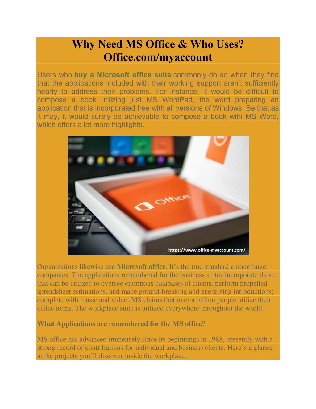 Why Need MS Office & Who Uses? Office.com/myaccount Users who buy a Microsoft office suite commonly do so when they find that the applications included with their working support aren’t sufficiently hearty to address their problems. For instance, it would be difficult to compose a book utilizing just MS WordPad, the word preparing an application that is incorporated free with all versions of Windows. Be that as it may, it would surely be achievable to compose a book with MS Word, which offers a lot more highlights. Organizations likewise use Microsoft office. It’s the true standard among huge companies. The applications remembered for the business suites incorporate those that can be utilized to oversee enormous databases of clients, perform propelled spreadsheet estimations, and make ground-breaking and energizing introductions; complete with music and video. MS claims that over a billion people utilize their office items. The workplace suite is utilized everywhere throughout the world. What Applications are remembered for the MS office? MS office has advanced immensely since its beginnings in 1988, presently with a strong record of contributions for individual and business clients. Here’s a glance at the projects you’ll discover inside the workplace.