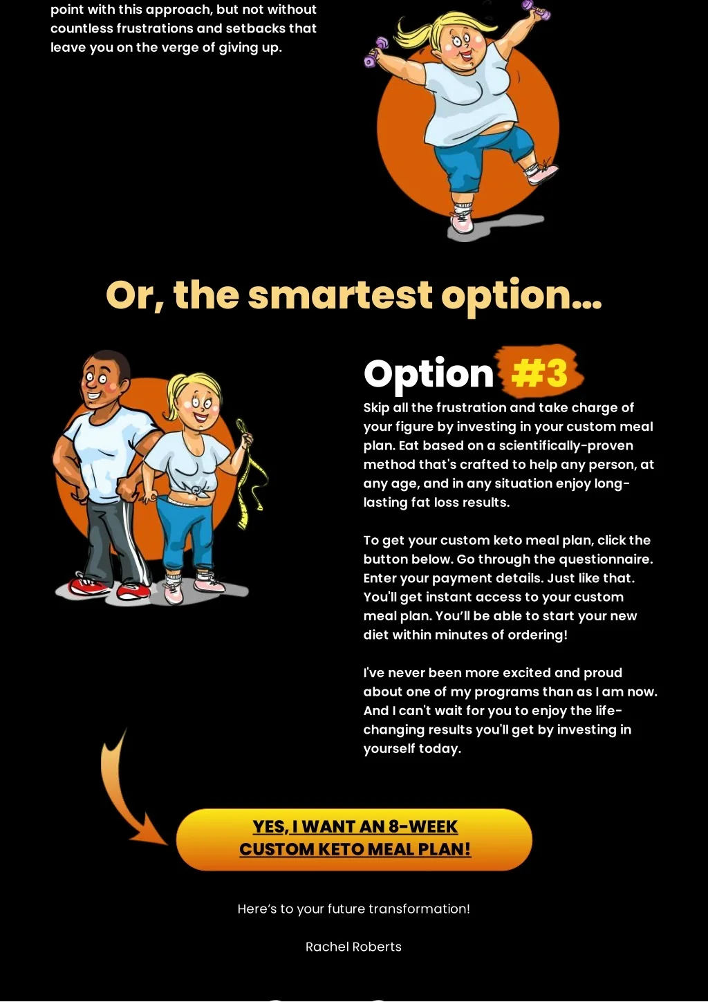point with this approach, but not without countless frustrations and setbacks that leave you on the verge of giving up. Or, the smartest option… Option Skip all the frustration and take charge of your figure by investing in your custom meal plan. Eat based on a scientifically-proven method that's crafted to help any person, at any age, and in any situation enjoy long- lasting fat loss results. #3 To get your custom keto meal plan, click the button below. Go through the questionnaire. Enter your payment details. Just like that. You'll get instant access to your custom meal plan. You’ll be able to start your new diet within minutes of ordering! I've never been more excited and proud about one of my programs than as I am now. And I can't wait for you to enjoy the life- changing results you'll get by investing in yourself today. YES, I WANT AN 8-WEEK CUSTOM KETO MEAL PLAN! Here’s to your future transformation! Rachel Roberts R R