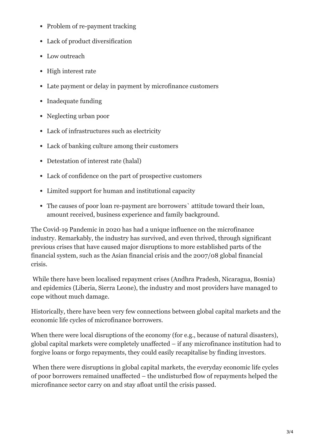 Problem of re-payment tracking Lack of product diversification Low outreach High interest rate Late payment or delay in payment by microfinance customers Inadequate funding Neglecting urban poor Lack of infrastructures such as electricity Lack of banking culture among their customers Detestation of interest rate (halal) Lack of confidence on the part of prospective customers Limited support for human and institutional capacity The causes of poor loan re-payment are borrowers` attitude toward their loan, amount received, business experience and family background. The Covid-19 Pandemic in 2020 has had a unique influence on the microfinance industry. Remarkably, the industry has survived, and even thrived, through significant previous crises that have caused major disruptions to more established parts of the financial system, such as the Asian financial crisis and the 2007/08 global financial crisis. While there have been localised repayment crises (Andhra Pradesh, Nicaragua, Bosnia) and epidemics (Liberia, Sierra Leone), the industry and most providers have managed to cope without much damage. Historically, there have been very few connections between global capital markets and the economic life cycles of microfinance borrowers. When there were local disruptions of the economy (for e.g., because of natural disasters), global capital markets were completely unaffected – if any microfinance institution had to forgive loans or forgo repayments, they could easily recapitalise by finding investors. When there were disruptions in global capital markets, the everyday economic life cycles of poor borrowers remained unaffected – the undisturbed flow of repayments helped the microfinance sector carry on and stay afloat until the crisis passed. 3/4