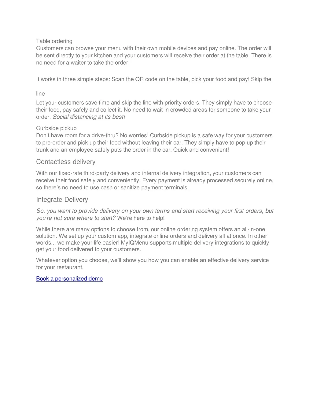 Table ordering Customers can browse your menu with their own mobile devices and pay online. The order will be sent directly to your kitchen and your customers will receive their order at the table. There is no need for a waiter to take the order! It works in three simple steps: Scan the QR code on the table, pick your food and pay! Skip the line Let your customers save time and skip the line with priority orders. They simply have to choose their food, pay safely and collect it. No need to wait in crowded areas for someone to take your order. Social distancing at its best! Curbside pickup Don’t have room for a drive-thru? No worries! Curbside pickup is a safe way for your customers to pre-order and pick up their food without leaving their car. They simply have to pop up their trunk and an employee safely puts the order in the car. Quick and convenient! Contactless delivery With our fixed-rate third-party delivery and internal delivery integration, your customers can receive their food safely and conveniently. Every payment is already processed securely online, so there’s no need to use cash or sanitize payment terminals. Integrate Delivery So, you want to provide delivery on your own terms and start receiving your first orders, but you’re not sure where to start? We’re here to help! While there are many options to choose from, our online ordering system offers an all-in-one solution. We set up your custom app, integrate online orders and delivery all at once. In other words... we make your life easier! MyIQMenu supports multiple delivery integrations to quickly get your food delivered to your customers. Whatever option you choose, we’ll show you how you can enable an effective delivery service for your restaurant. Book a personalized demo