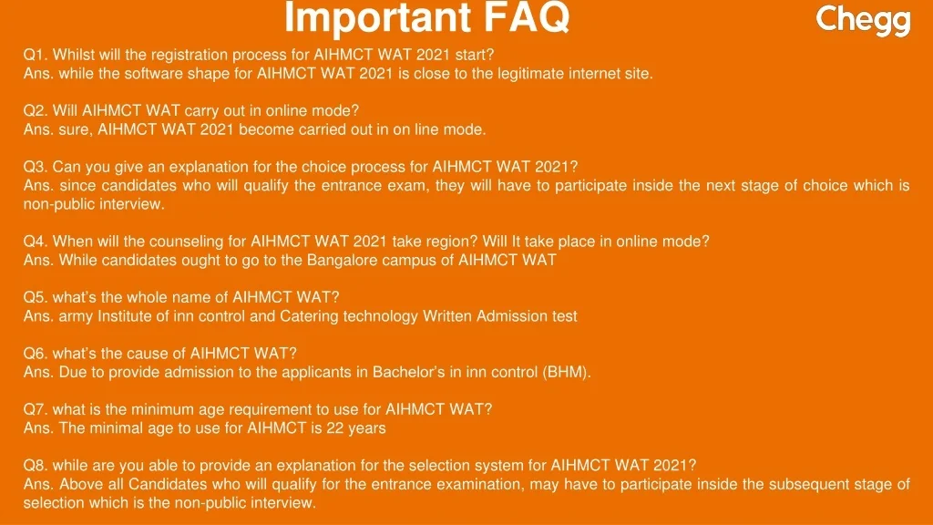 Important FAQ Q1. Whilst will the registration process for AIHMCT WAT 2021 start? Ans. while the software shape for AIHMCT WAT 2021 is close to the legitimate internet site. Q2. Will AIHMCT WAT carry out in online mode? Ans. sure, AIHMCT WAT 2021 become carried out in on line mode. Q3. Can you give an explanation for the choice process for AIHMCT WAT 2021? Ans. since candidates who will qualify the entrance exam, they will have to participate inside the next stage of choice which is non-public interview. Q4. When will the counseling for AIHMCT WAT 2021 take region? Will It take place in online mode? Ans. While candidates ought to go to the Bangalore campus of AIHMCT WAT Q5. what’s the whole name of AIHMCT WAT? Ans. army Institute of inn control and Catering technology Written Admission test Q6. what’s the cause of AIHMCT WAT? Ans. Due to provide admission to the applicants in Bachelor’s in inn control (BHM). Q7. what is the minimum age requirement to use for AIHMCT WAT? Ans. The minimal age to use for AIHMCT is 22 years Q8. while are you able to provide an explanation for the selection system for AIHMCT WAT 2021? Ans. Above all Candidates who will qualify for the entrance examination, may have to participate inside the subsequent stage of selection which is the non-public interview.