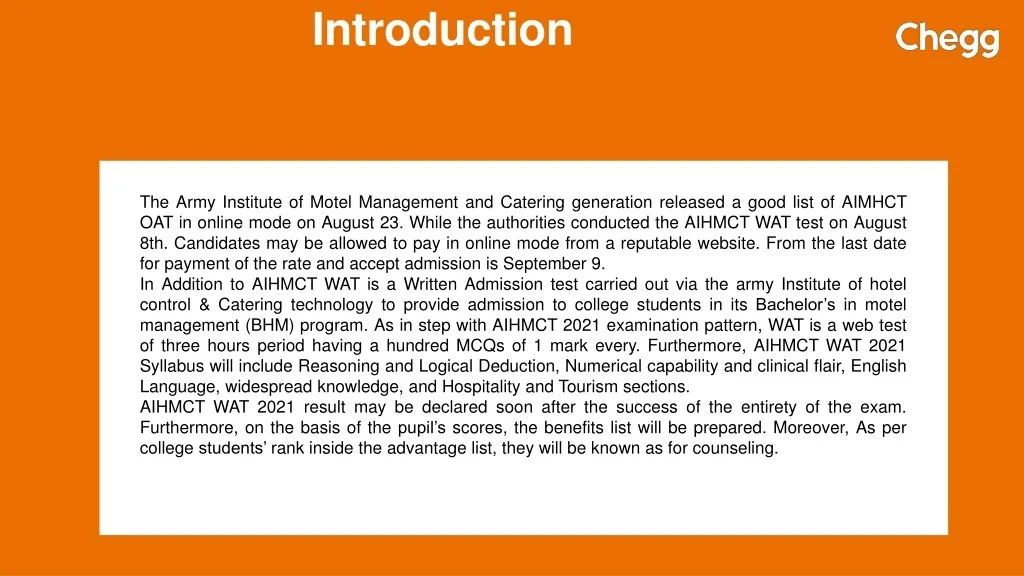 AIHMCT WAT Exam<br><br>The Army Institute of Motel Management and Catering generation released a good list of AIMHCT OAT in online mode on August 23. While the authorities conducted the AIHMCT WAT test on August 8th. Candidates may be allowed to pay in online mode from a reputable website. From the last date for payment of the rate and accept admission is September 9.<br><br>Read more<br>https://www.cheggindia.com/entrance-exams/aihmct-wat/