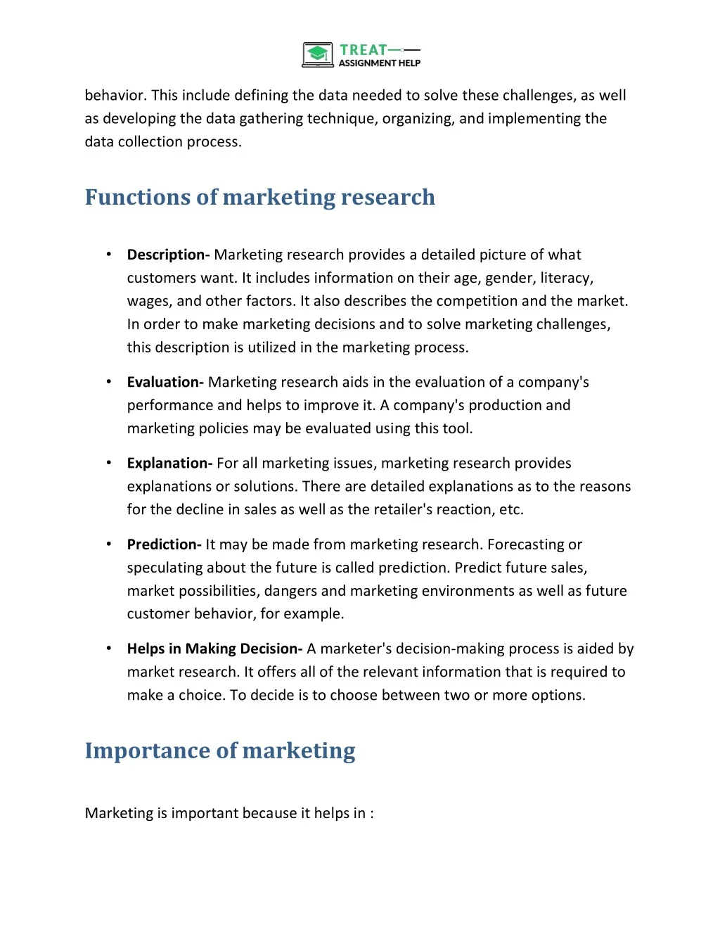 behavior. This include defining the data needed to solve these challenges, as well as developing the data gathering technique, organizing, and implementing the data collection process. Functions of marketing research •Description- Marketing research provides a detailed picture of what customers want. It includes information on their age, gender, literacy, wages, and other factors. It also describes the competition and the market. In order to make marketing decisions and to solve marketing challenges, this description is utilized in the marketing process. •Evaluation- Marketing research aids in the evaluation of a company's performance and helps to improve it. A company's production and marketing policies may be evaluated using this tool. •Explanation- For all marketing issues, marketing research provides explanations or solutions. There are detailed explanations as to the reasons for the decline in sales as well as the retailer's reaction, etc. •Prediction- It may be made from marketing research. Forecasting or speculating about the future is called prediction. Predict future sales, market possibilities, dangers and marketing environments as well as future customer behavior, for example. •Helps in Making Decision- A marketer's decision-making process is aided by market research. It offers all of the relevant information that is required to make a choice. To decide is to choose between two or more options. Importance of marketing Marketing is important because it helps in :