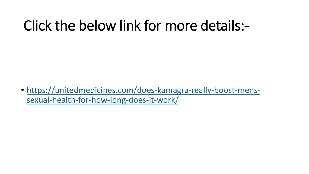 Click the below link for more details: Click the below link for more details:- - • https://unitedmedicines.com/does-kamagra-really-boost-mens- sexual-health-for-how-long-does-it-work/