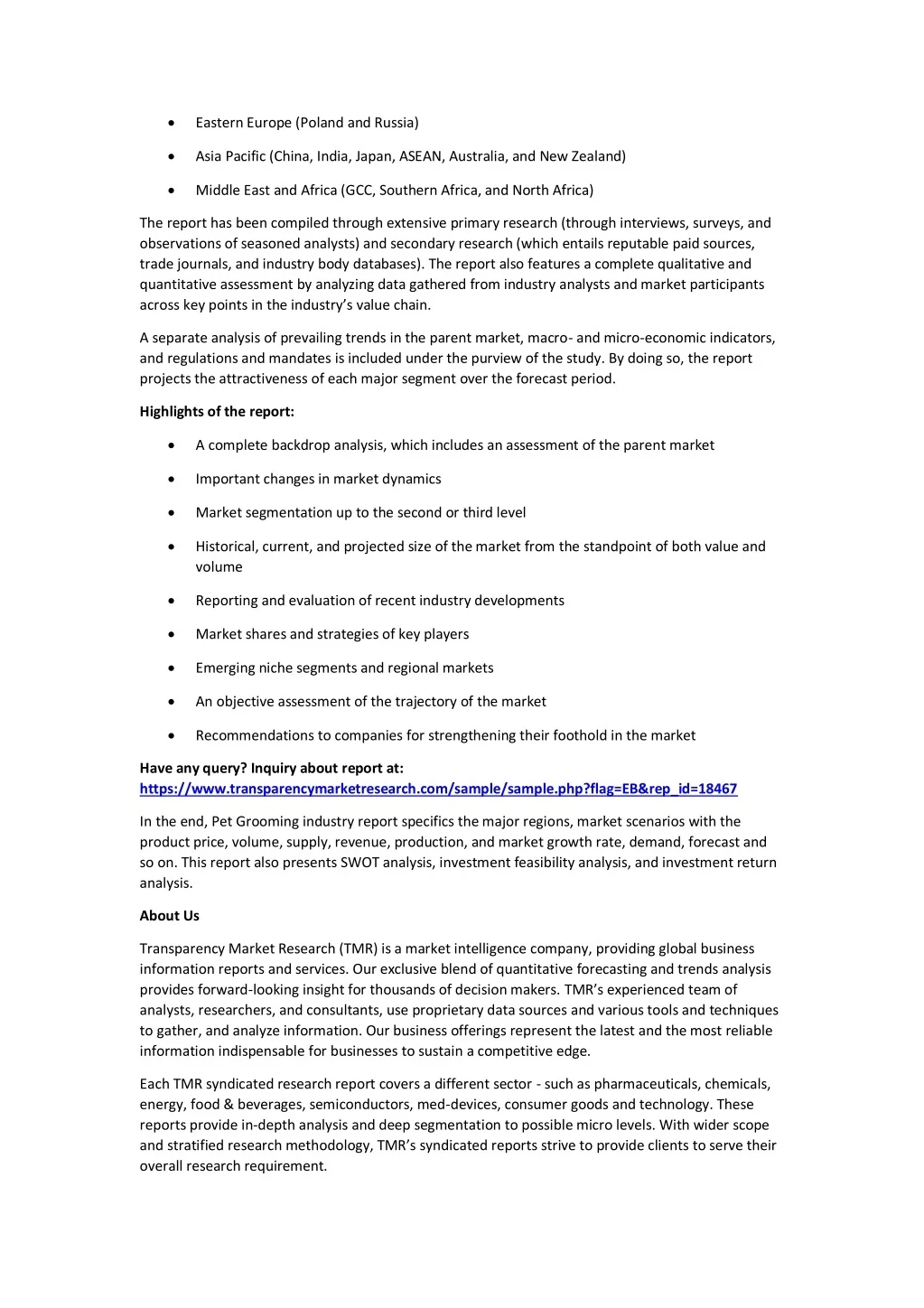 Eastern Europe (Poland and Russia) Asia Pacific (China, India, Japan, ASEAN, Australia, and New Zealand) Middle East and Africa (GCC, Southern Africa, and North Africa) The report has been compiled through extensive primary research (through interviews, surveys, and observations of seasoned analysts) and secondary research (which entails reputable paid sources, trade journals, and industry body databases). The report also features a complete qualitative and quantitative assessment by analyzing data gathered from industry analysts and market participants across key points in the industry’s value chain. A separate analysis of prevailing trends in the parent market, macro- and micro-economic indicators, and regulations and mandates is included under the purview of the study. By doing so, the report projects the attractiveness of each major segment over the forecast period. Highlights of the report: A complete backdrop analysis, which includes an assessment of the parent market Important changes in market dynamics Market segmentation up to the second or third level Historical, current, and projected size of the market from the standpoint of both value and volume Reporting and evaluation of recent industry developments Market shares and strategies of key players Emerging niche segments and regional markets An objective assessment of the trajectory of the market Recommendations to companies for strengthening their foothold in the market Have any query? Inquiry about report at: https://www.transparencymarketresearch.com/sample/sample.php?flag=EB&rep_id=18467 In the end, Pet Grooming industry report specifics the major regions, market scenarios with the product price, volume, supply, revenue, production, and market growth rate, demand, forecast and so on. This report also presents SWOT analysis, investment feasibility analysis, and investment return analysis. About Us Transparency Market Research (TMR) is a market intelligence company, providing global business information reports and services. Our exclusive blend of quantitative forecasting and trends analysis provides forward-looking insight for thousands of decision makers. TMR’s experienced team of analysts, researchers, and consultants, use proprietary data sources and various tools and techniques to gather, and analyze information. Our business offerings represent the latest and the most reliable information indispensable for businesses to sustain a competitive edge. Each TMR syndicated research report covers a different sector - such as pharmaceuticals, chemicals, energy, food & beverages, semiconductors, med-devices, consumer goods and technology. These reports provide in-depth analysis and deep segmentation to possible micro levels. With wider scope and stratified research methodology, TMR’s syndicated reports strive to provide clients to serve their overall research requirement.
