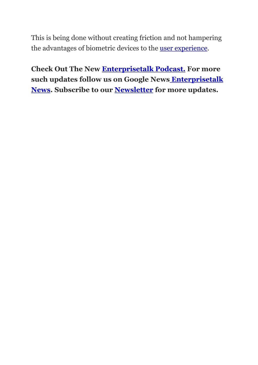 This is being done without creating friction and not hampering the advantages of biometric devices to the user experience. Check Out The New Enterprisetalk Podcast. For more such updates follow us on Google News Enterprisetalk News. Subscribe to our Newsletter for more updates.