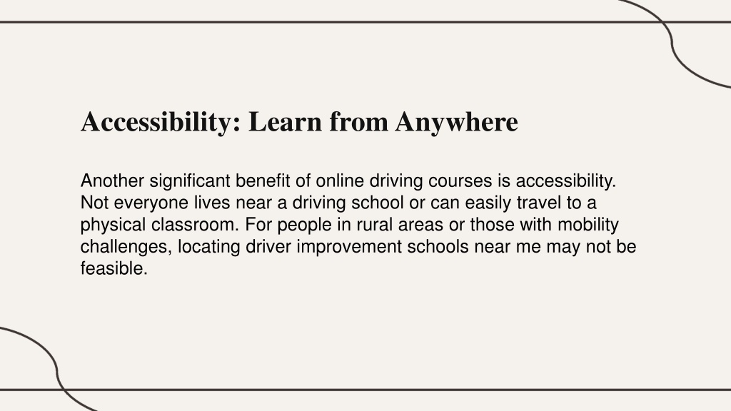 Accessibility: Learn from Anywhere • Another significant benefit of online driving courses is accessibility. Not everyone lives near a driving school or can easily travel to a physical classroom. For people in rural areas or those with mobility challenges, locating driver improvement schools near me may not be feasible.