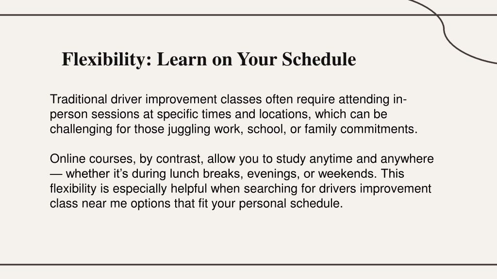 Flexibility: Learn on Your Schedule • Traditional driver improvement classes often require attending in-person sessions at specific times and locations, which can be challenging for those juggling work, school, or family commitments. • Online courses, by contrast, allow you to study anytime and anywhere — whether it’s during lunch breaks, evenings, or weekends. This flexibility is especially helpful when searching for drivers improvement class near me options that fit your personal schedule.