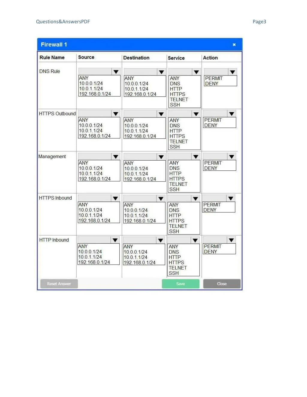 Questions&AnswersPDF Page6 DNSRule–ANY-->ANY-->DNS-->PERMIT HTTPSOutbound–10.0.0.1/24-->ANY-->HTTPS-->PERMIT Management–ANY-->ANY-->SSH-->PERMIT HTTPSInbound–ANY-->ANY-->HTTPS-->PERMIT HTTPInbound–ANY-->ANY-->HTTP-->DENY Firewall2: