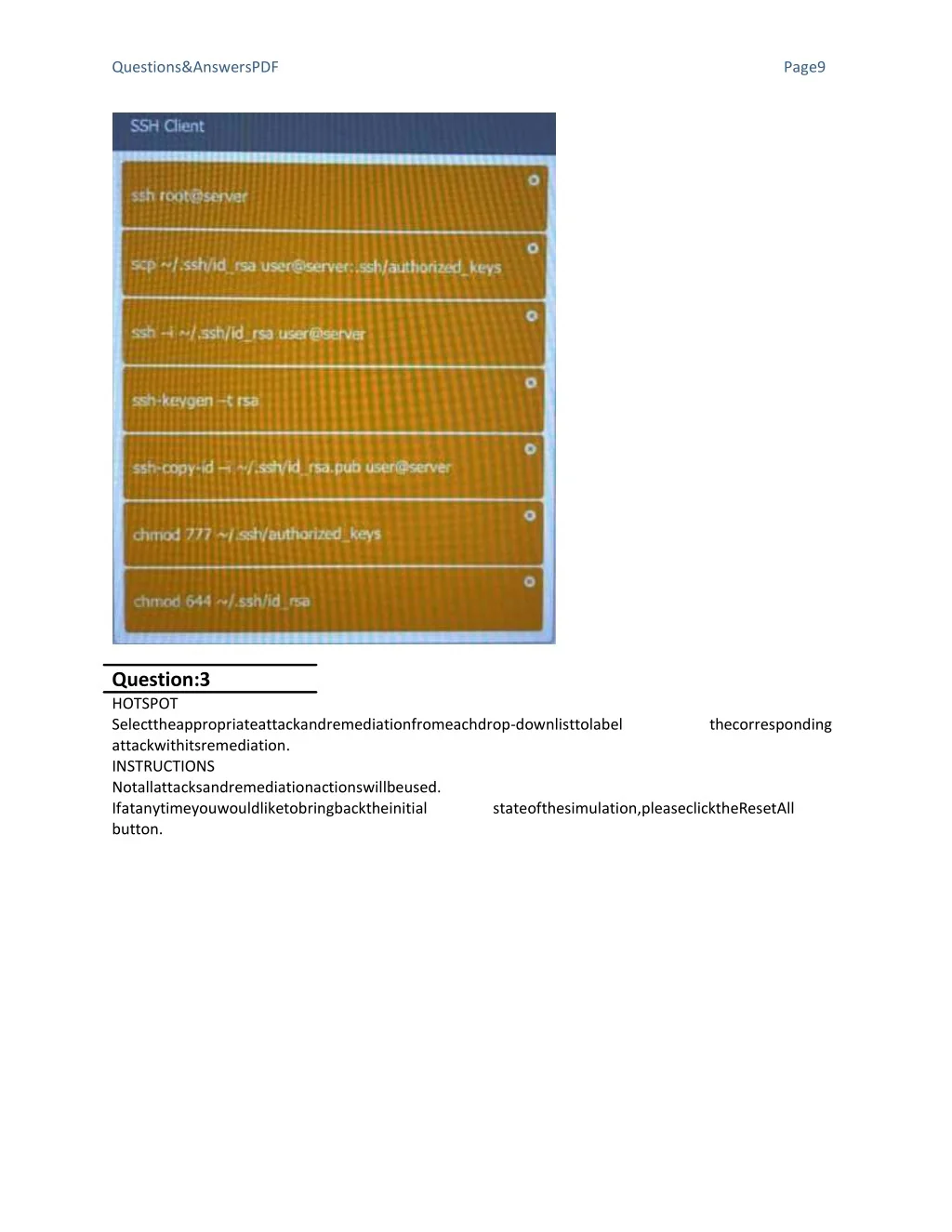Questions&AnswersPDF Page9 Question:3 HOTSPOT Selecttheappropriateattackandremediationfromeachdrop-downlisttolabel attackwithitsremediation. INSTRUCTIONS Notallattacksandremediationactionswillbeused. Ifatanytimeyouwouldliketobringbacktheinitial button. thecorresponding stateofthesimulation,pleaseclicktheResetAll