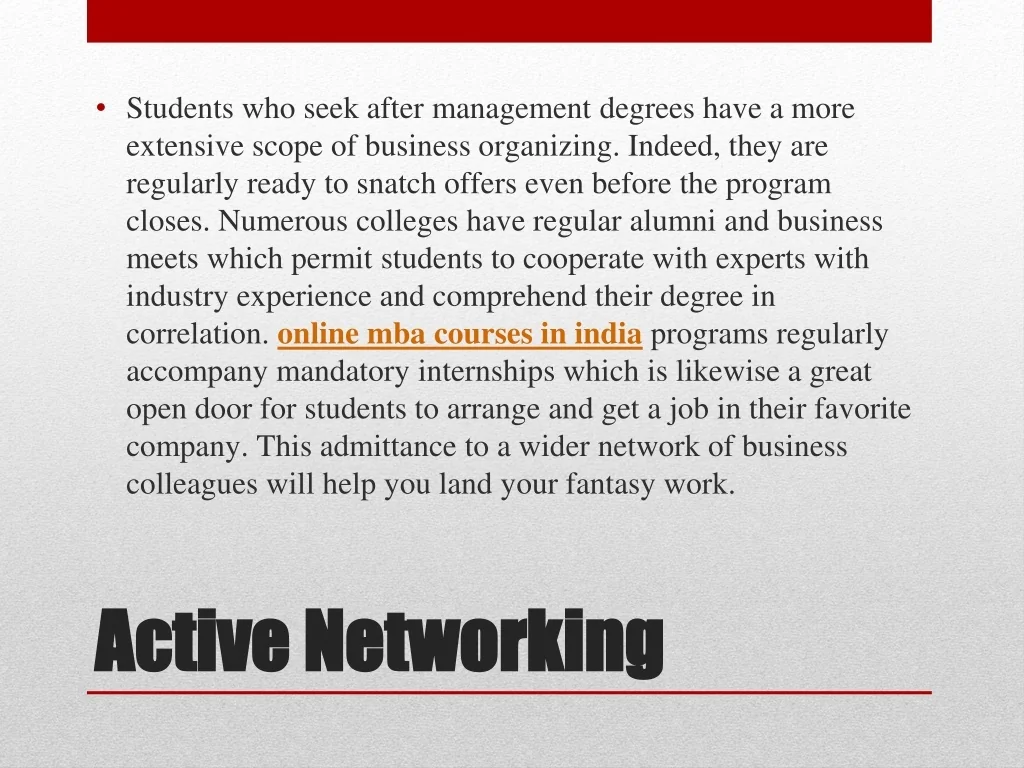 Students who seek after management degrees have a more extensive scope of business organizing. Indeed, they are regularly ready to snatch offers even before the program closes. Numerous colleges have regular alumni and business meets which permit students to cooperate with experts with industry experience and comprehend their degree in correlation. online mba courses in indiaprograms regularly accompany mandatory internships which is likewise a great open door for students to arrange and get a job in their favorite company. This admittance to a wider network of business colleagues will help you land your fantasy work. Active Networking