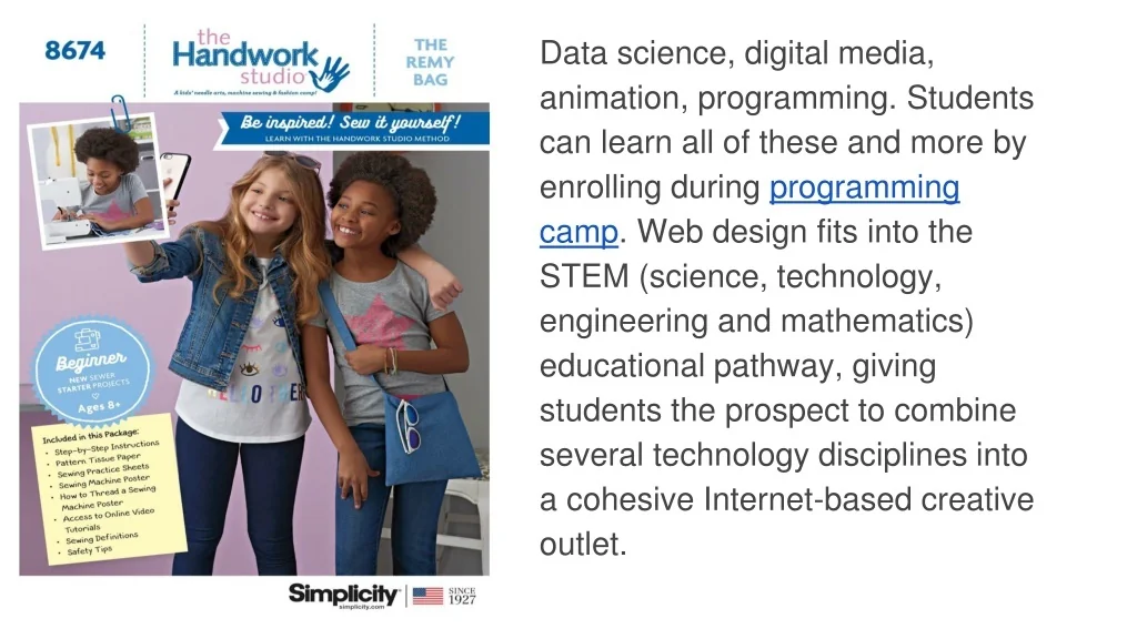 Data science, digital media, animation, programming. Students can learn all of these and more by enrolling during programming camp. Web design fits into the STEM (science, technology, engineering and mathematics) educational pathway, giving students the prospect to combine several technology disciplines into a cohesive Internet-based creative outlet.
