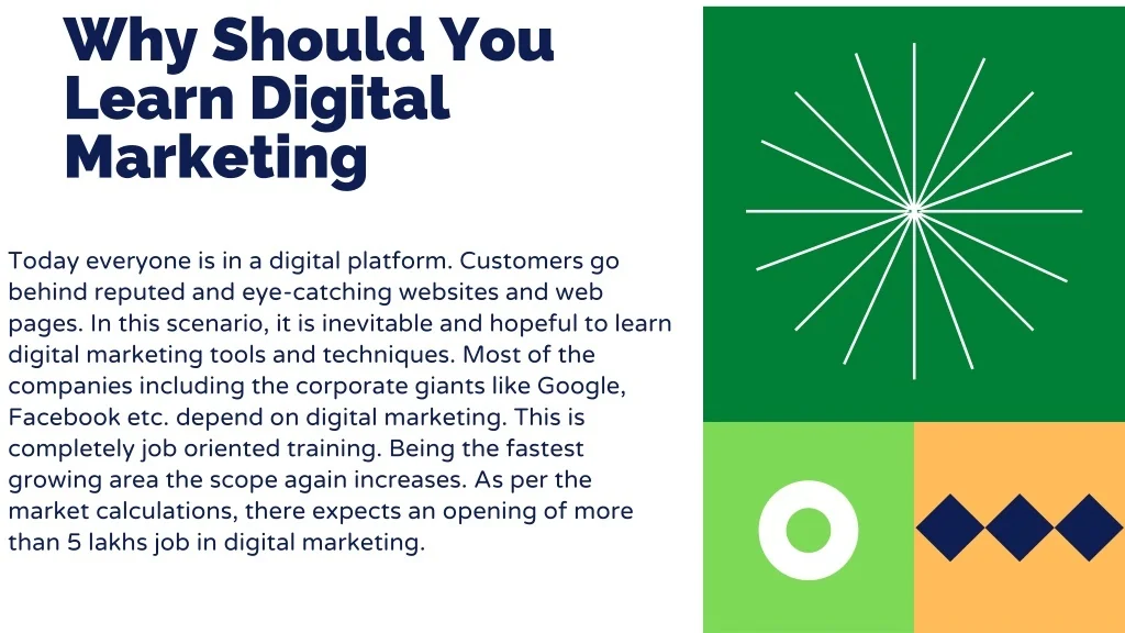 Why Should You Learn Digital Marketing Today everyone is in a digital platform. Customers go behind reputed and eye-catching websites and web pages. In this scenario, it is inevitable and hopeful to learn digital marketing tools and techniques. Most of the companies including the corporate giants like Google, Facebook etc. depend on digital marketing. This is completely job oriented training. Being the fastest growing area the scope again increases. As per the market calculations, there expects an opening of more than 5 lakhs job in digital marketing.