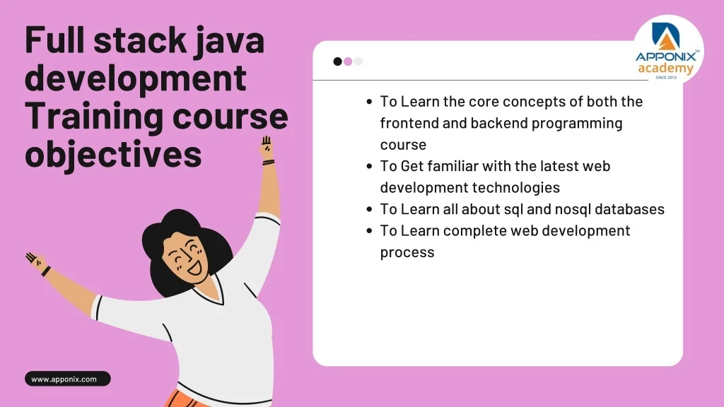 Full stack java development Training course objectives To Learn the core concepts of both the frontend and backend programming course To Get familiar with the latest web development technologies To Learn all about sql and nosql databases To Learn complete web development process www.apponix.com