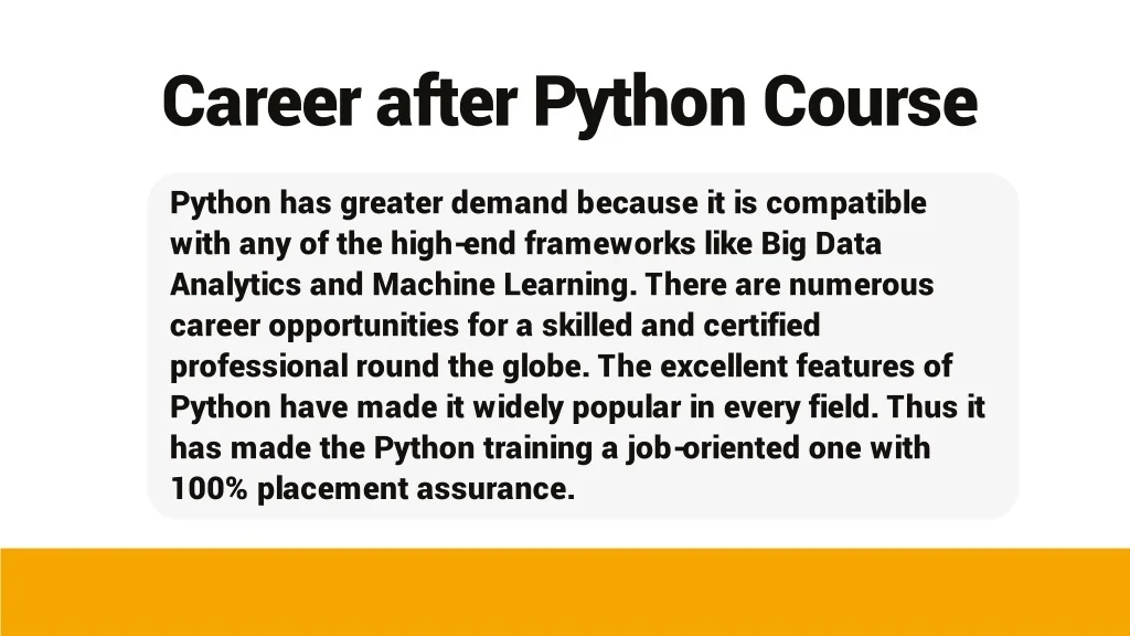 Career after Python Course Python has greater demand because it is compatible with any of the high-end frameworks like Big Data Analytics and Machine Learning. There are numerous career opportunities for a skilled and certified professional round the globe. The excellent features of Python have made it widely popular in every field. Thus it has made the Python training a job-oriented one with 100% placement assurance.
