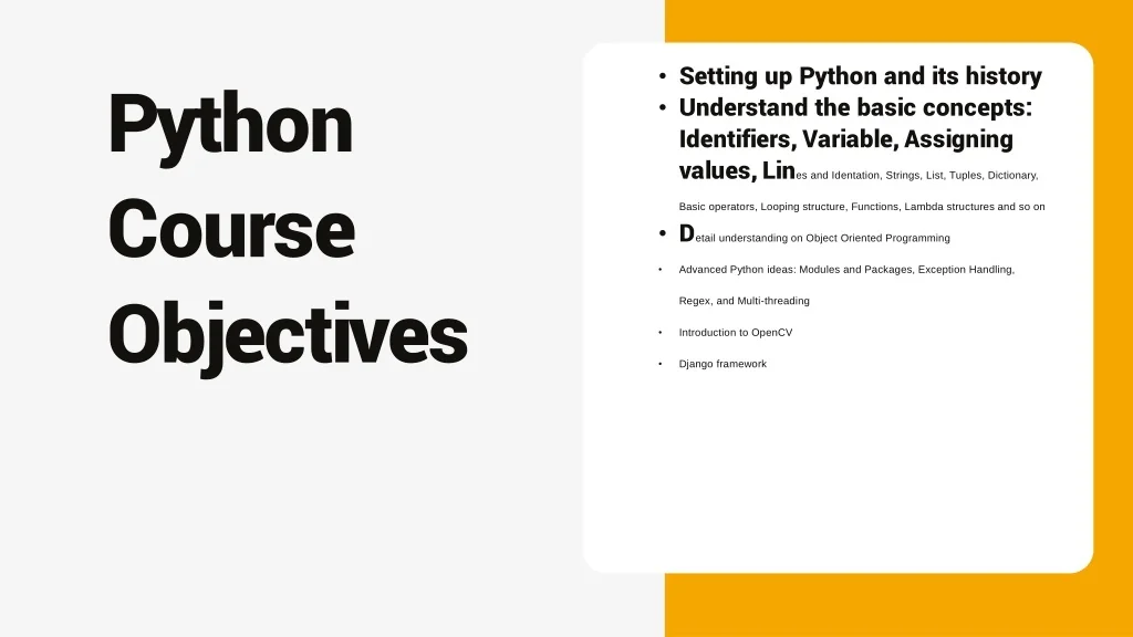Setting up Python and its history • Understand the basic concepts: Identifiers, Variable, Assigning values, Lines and Identation, Strings, List, Tuples, Dictionary, Basic operators, Looping structure, Functions, Lambda structures and so on • Detail understanding on Object Oriented Programming • Advanced Python ideas: Modules and Packages, Exception Handling, Regex, and Multi-threading • Introduction to OpenCV • Django framework • Python Course Objectives