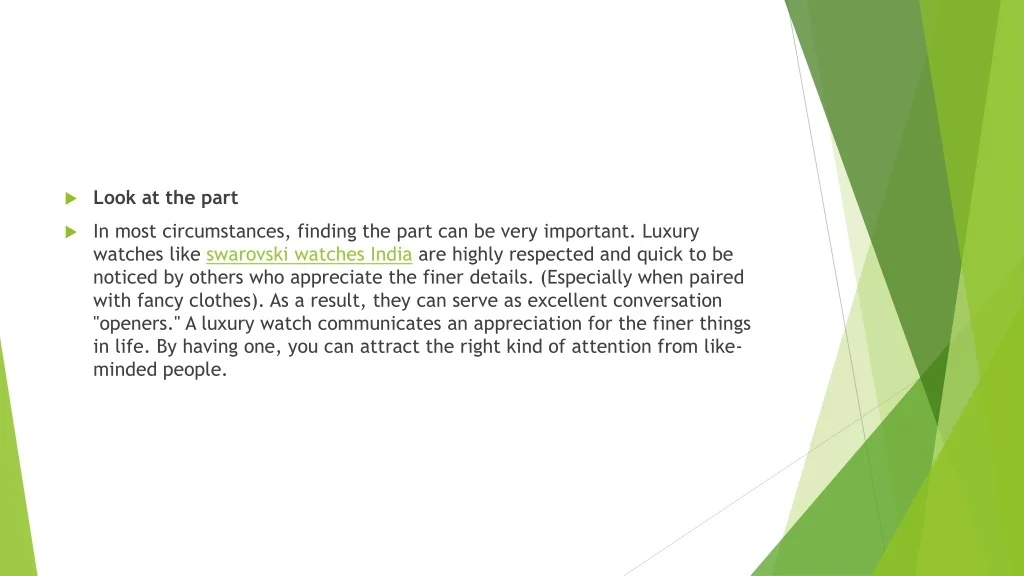 Look at the part • In most circumstances, finding the part can be very important. Luxury watches like swarovski watches India are highly respected and quick to be noticed by others who appreciate the finer details. (Especially when paired with fancy clothes). As a result, they can serve as excellent conversation "openers." A luxury watch communicates an appreciation for the finer things in life. By having one, you can attract the right kind of attention from like-minded people.