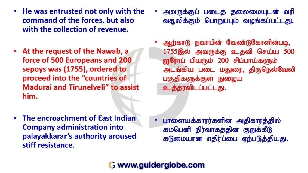 • He was entrusted not only with the command of the forces, but also with the collection of revenue. • mtUf;Fg mtUf;Fg; ; gilj tR+ypf;Fk tR+ypf;Fk; ; nghWg;Gk gilj; ; jiyikAld jiyikAld; ; tup nghWg;Gk; ; toq;fg;gl;lJ toq;fg;gl;lJ. . tup • Mw;fhL Mw;fhL ethgpd 1755,y; 1755,y; mtUf;F INuhg INuhg; ; gpaUk gpaUk; 200 mlq;fpa mlq;fpa gil gFjpfSf;Fs gFjpfSf;Fs; ; Eioa cj;jutplg;gl;lJ cj;jutplg;gl;lJ. . ethgpd; ; Ntz;LNfhspd;gb Ntz;LNfhspd;gb> > mtUf;F cjtp cjtp nra;a ; 200 rpg;gha;fSk rpg;gha;fSk; ; gil kJiu kJiu> > jpUney;Ntyp Eioa • At the request of the Nawab, a force of 500 Europeans and 200 sepoys was (1755), ordered to proceed into the “countries of Madurai and Tirunelveli” to assist him. nra;a 500 500 jpUney;Ntyp • The encroachment of East Indian Company administration into palayakkarar’s authority aroused stiff resistance. • ghisaf;fhuu;fspd ghisaf;fhuu;fspd; ; mjpfhuj;jpy fk;ngdp fk;ngdp epu;thfj;jpd epu;thfj;jpd; ; FWf;fPL fLikahd fLikahd vjpu;g;ig vjpu;g;ig Vw;gLj;jpaJ mjpfhuj;jpy; ; FWf;fPL Vw;gLj;jpaJ. .