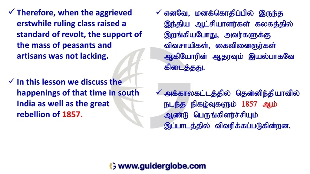 Therefore, when the aggrieved erstwhile ruling class raised a standard of revolt, the support of the mass of peasants and artisans was not lacking. vdNt vdNt> > kdf;nfhjpg;gpy kdf;nfhjpg;gpy; , , ,e;jpa e;jpa Ml;rpahsu;fs Ml;rpahsu;fs; ; fyfj;jpy , ,wq;fpaNghJ wq;fpaNghJ> > mtu;fSf;F mtu;fSf;F tptrhapfs tptrhapfs;> ;> iftpidQu;fs iftpidQu;fs; ; MfpNahupd MfpNahupd; ; MjuTk MjuTk; , fpilj;jJ fpilj;jJ. . ; ,Ue;j Ue;j fyfj;jpy; ; ; ,ay;ghfNt ay;ghfNt In this lesson we discuss the happenings of that time in south India as well as the great rebellion of 1857. mf;fhyfl;lj;jpy mf;fhyfl;lj;jpy; ; njd;dpe;jpahtpy ele;j ele;j epfo;TfSk epfo;TfSk; ; 1857 Mk Mz;L Mz;L ngUq;fpsu;r;rpAk ngUq;fpsu;r;rpAk; ; , ,g;ghlj;jpy g;ghlj;jpy; ; tptupf;fg;gLfpd;wd tptupf;fg;gLfpd;wd. . njd;dpe;jpahtpy; ; 1857 Mk; ;