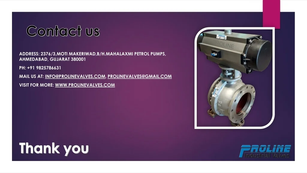 Contact us Address: 2376/3,Moti Makeriwad,B/h.Mahalaxmi Petrol Pumps, Ahmedabad, Gujarat 380001 Ph: +91 9825786631 Mail us at: info@prolinevalves.COM, PROLINEVALVES@GMAIL.COM Visit for more: www.prolinevalves.com Thank you