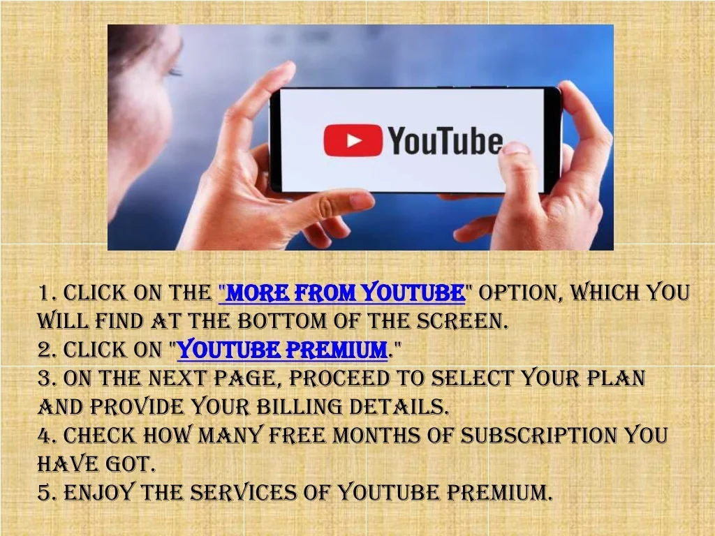 1. Click on the "More from YouTube More from YouTube" option, which you will find at the bottom of the screen. 2. Click on "YouTube Premium YouTube Premium." 3. On the next page, proceed to select your plan and provide your billing details. 4. Check how many free months of subscription you have got. 5. Enjoy the services of YouTube Premium.