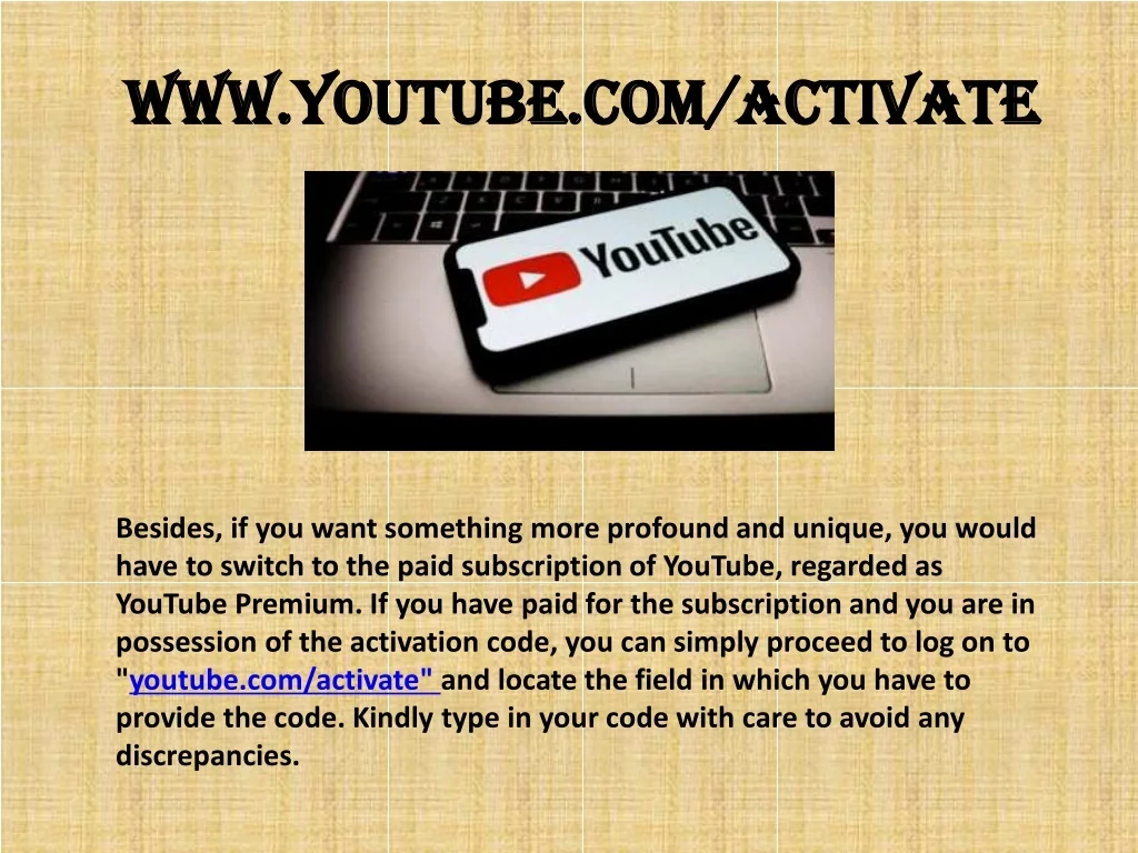 www.youtube.com/activate www.youtube.com/activate Besides, if you want something more profound and unique, you would have to switch to the paid subscription of YouTube, regarded as YouTube Premium. If you have paid for the subscription and you are in possession of the activation code, you can simply proceed to log on to "youtube.com/activate" and locate the field in which you have to provide the code. Kindly type in your code with care to avoid any discrepancies.