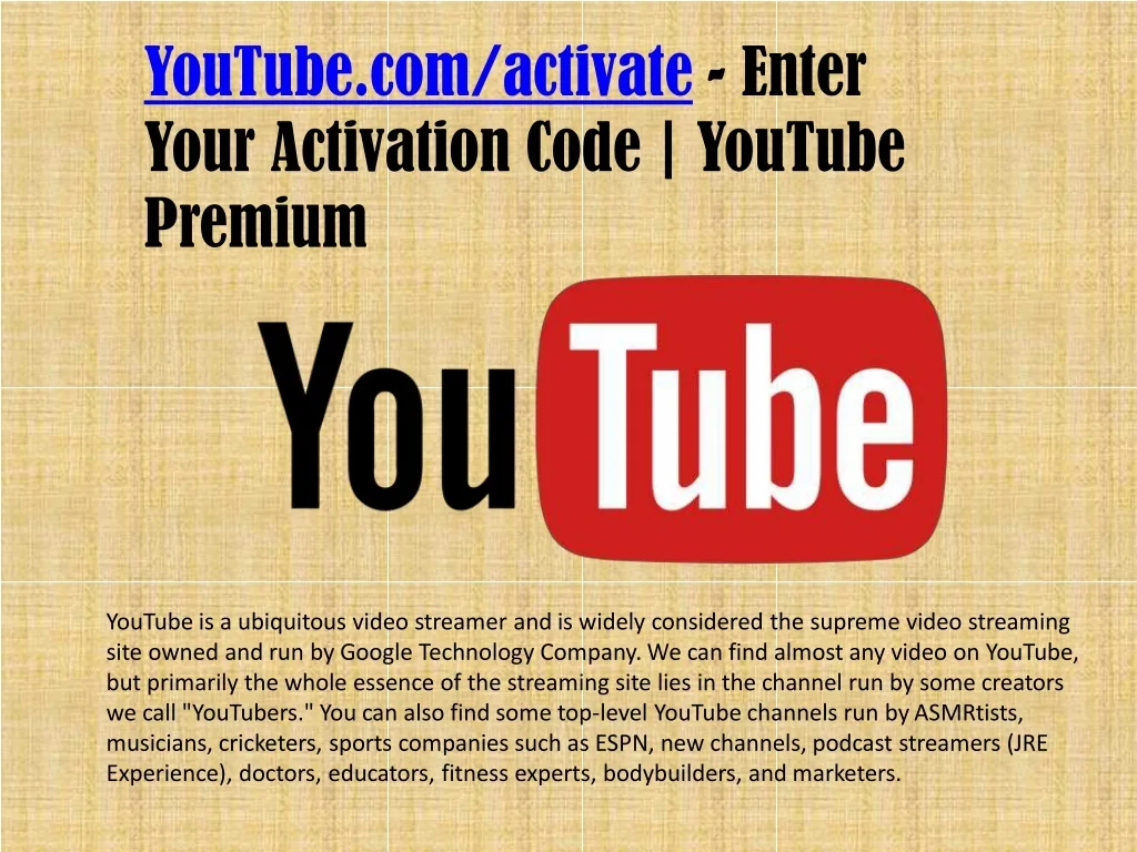YouTube.com/activate - Enter Your Activation Code | YouTube Premium YouTube is a ubiquitous video streamer and is widely considered the supreme video streaming site owned and run by Google Technology Company. We can find almost any video on YouTube, but primarily the whole essence of the streaming site lies in the channel run by some creators we call "YouTubers." You can also find some top-level YouTube channels run by ASMRtists, musicians, cricketers, sports companies such as ESPN, new channels, podcast streamers (JRE Experience), doctors, educators, fitness experts, bodybuilders, and marketers.