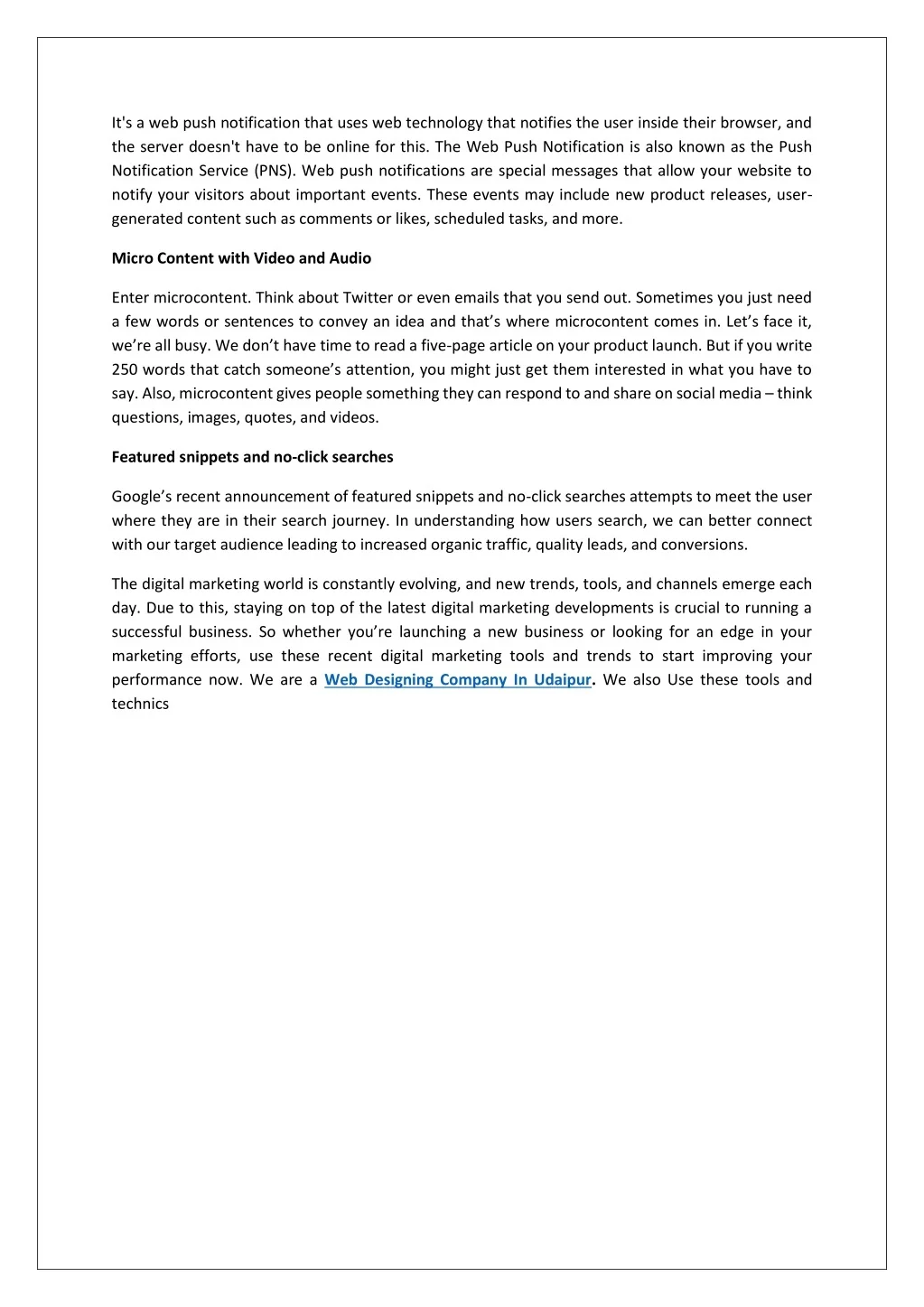 It's a web push notification that uses web technology that notifies the user inside their browser, and the server doesn't have to be online for this. The Web Push Notification is also known as the Push Notification Service (PNS). Web push notifications are special messages that allow your website to notify your visitors about important events. These events may include new product releases, user- generated content such as comments or likes, scheduled tasks, and more. Micro Content with Video and Audio Enter microcontent. Think about Twitter or even emails that you send out. Sometimes you just need a few words or sentences to convey an idea and that’s where microcontent comes in. Let’s face it, we’re all busy. We don’t have time to read a five-page article on your product launch. But if you write 250 words that catch someone’s attention, you might just get them interested in what you have to say. Also, microcontent gives people something they can respond to and share on social media – think questions, images, quotes, and videos. Featured snippets and no-click searches Google’s recent announcement of featured snippets and no-click searches attempts to meet the user where they are in their search journey. In understanding how users search, we can better connect with our target audience leading to increased organic traffic, quality leads, and conversions. The digital marketing world is constantly evolving, and new trends, tools, and channels emerge each day. Due to this, staying on top of the latest digital marketing developments is crucial to running a successful business. So whether you’re launching a new business or looking for an edge in your marketing efforts, use these recent digital marketing tools and trends to start improving your performance now. We are a Web Designing Company In Udaipur. We also Use these tools and technics