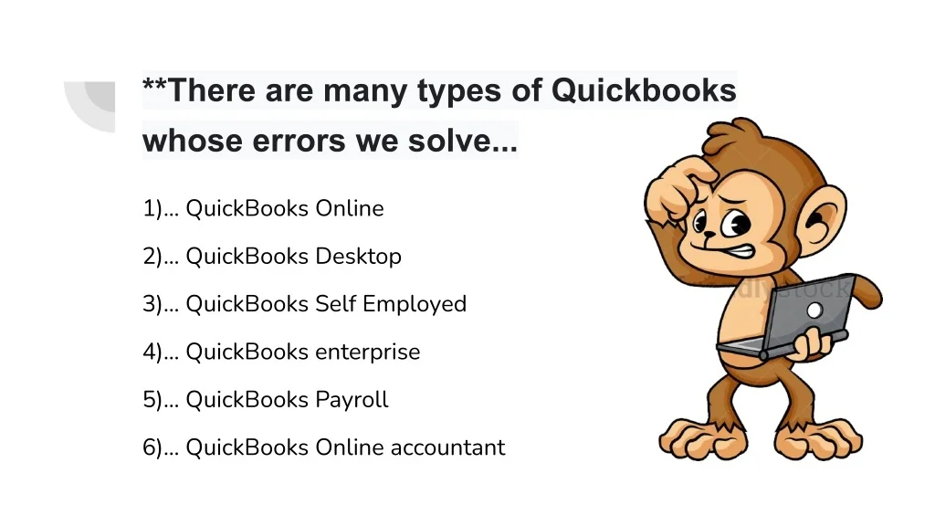 **There are many types of Quickbooks whose errors we solve... 1)... QuickBooks Online 2)... QuickBooks Desktop 3)... QuickBooks Self Employed 4)... QuickBooks enterprise 5)... QuickBooks Payroll 6)... QuickBooks Online accountant