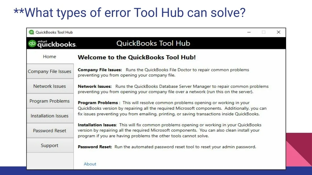 What is QuickBooks Tool Hub QuickBooks tool hub is a collection of all QuickBooks tools in one application. This is only one tool who can solve all common errors of QuickBooks. You should always try this QuickBooks tool hub whenever you face any problem with QuickBooks Accounting Software. It’s so easy to use and solve the problems.