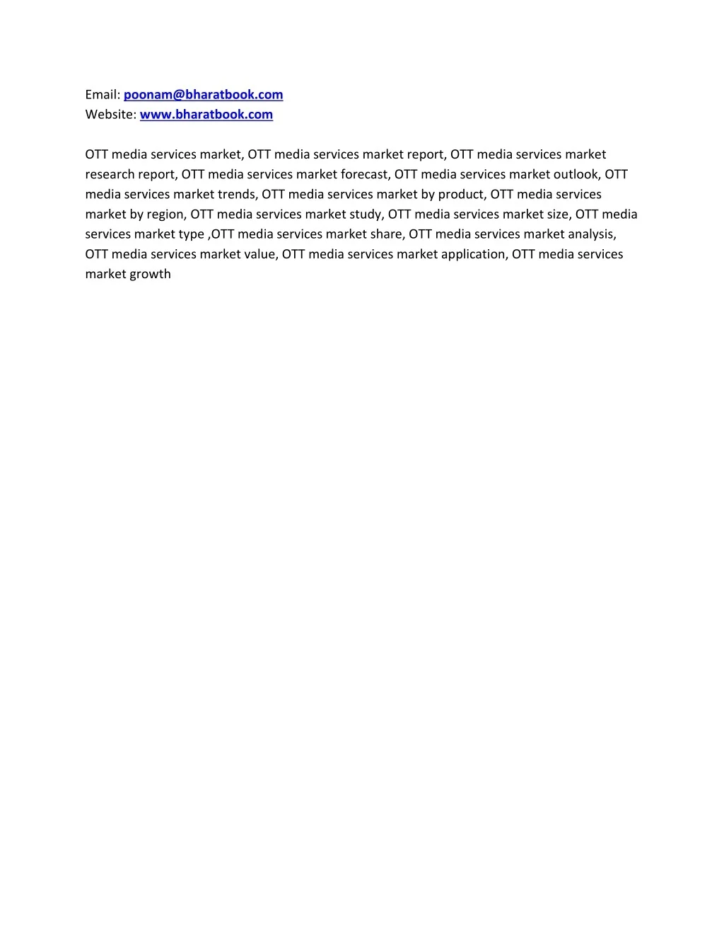 Email: poonam@bharatbook.com Website: www.bharatbook.com OTT media services market, OTT media services market report, OTT media services market research report, OTT media services market forecast, OTT media services market outlook, OTT media services market trends, OTT media services market by product, OTT media services market by region, OTT media services market study, OTT media services market size, OTT media services market type ,OTT media services market share, OTT media services market analysis, OTT media services market value, OTT media services market application, OTT media services market growth