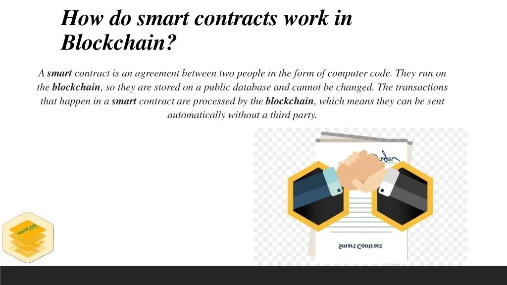 How do smart contracts work in Blockchain? A smart contract is an agreement between two people in the form of computer code. They run on the blockchain, so they are stored on a public database and cannot be changed. The transactions that happen in a smart contract are processed by the blockchain, which means they can be sent automatically without a third party.
