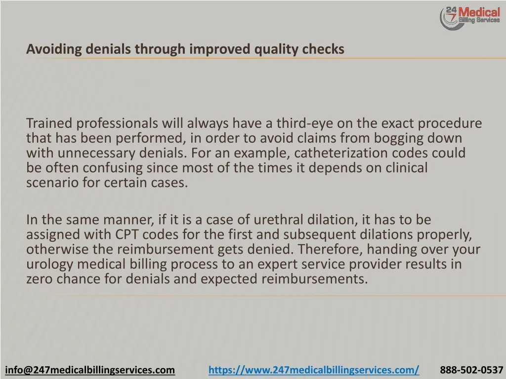 Avoiding denials through improved quality checks Trained professionals will always have a third-eye on the exact procedure that has been performed, in order to avoid claims from bogging down with unnecessary denials. For an example, catheterization codes could be often confusing since most of the times it depends on clinical scenario for certain cases. In the same manner, if it is a case of urethral dilation, it has to be assigned with CPT codes for the first and subsequent dilations properly, otherwise the reimbursement gets denied. Therefore, handing over your urology medical billing process to an expert service provider results in zero chance for denials and expected reimbursements. info@247medicalbillingservices.comhttps://www.247medicalbillingservices.com/888-502-0537