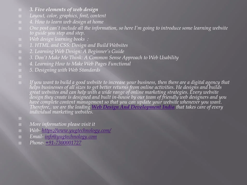 3. Five elements of web design • Layout, color, graphics, font, content • 4. How to learn web design at home • One post can’t include all the information, so here I’m going to introduce some learning website to guide you step and step. • Web design learning books: • 1. HTML and CSS: Design and Build Websites • 2. Learning Web Design: A Beginner’s Guide • 3. Don’t Make Me Think: A Common Sense Approach to Web Usability • 4. Learning How to Make Web Pages Functional • 5. Designing with Web Standards • If you want to build a good website to increase your business, then there are a digital agency that helps businesses of all sizes to get better returns from online activities. He designs and builds great websites and can help with a wide range of online marketing strategies. Every website design they create is designed and built in-house by our team of friendly web designers and you have complete content management so that you can update your website whenever you want. Therefore,. we are the leading Web Design And Development Indiathat takes care of every individual marketing websites. • More information please visit it • Web- https://www.yugtechnology.com/ • Email- info@yugtechnology.com • Phone- +91-7300001727