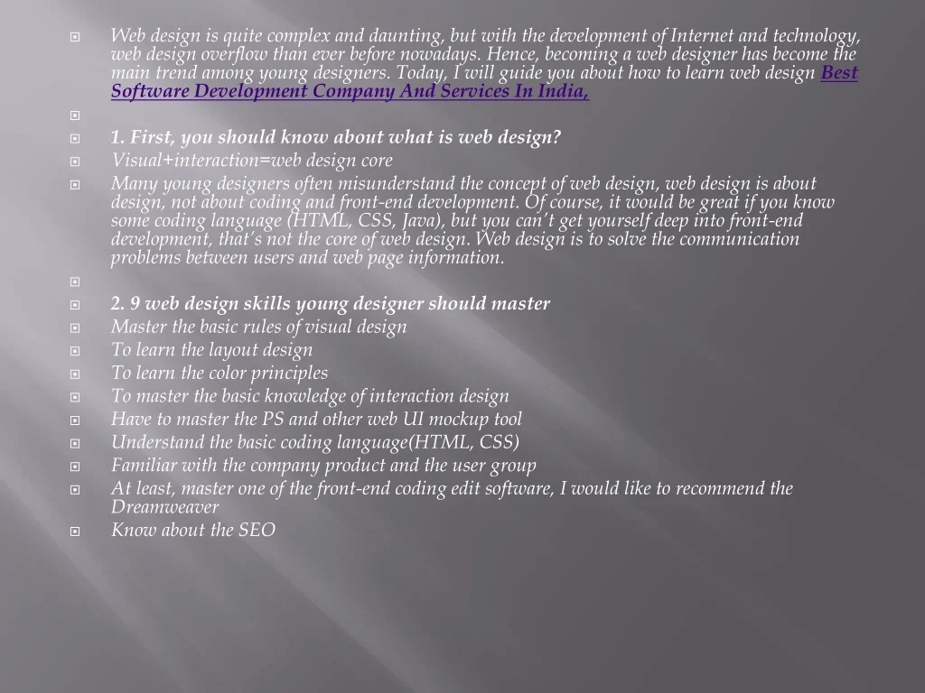 Web design is quite complex and daunting, but with the development of Internet and technology, web design overflow than ever before nowadays. Hence, becoming a web designer has become the main trend among young designers. Today, I will guide you about how to learn web design Best Software Development Company And Services In India, <br><br>1. First, you should know about what is web design?<br>Visual interaction=web design core<br>Many young designers often misunderstand the concept of web design, web design is about design, not about coding and front-end development. Of course, it would be great if you k