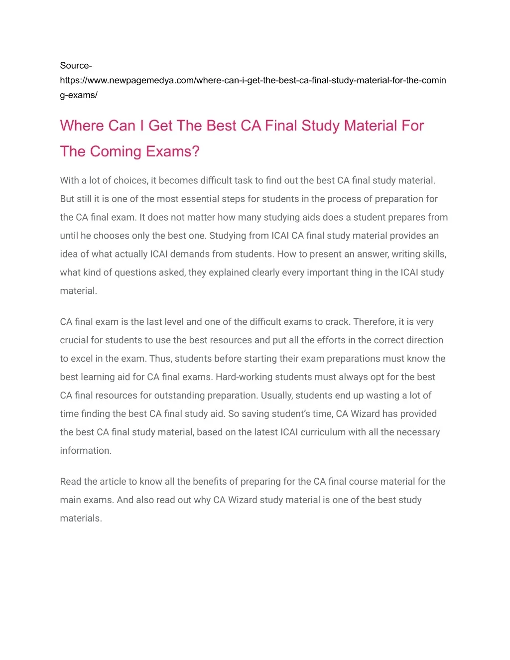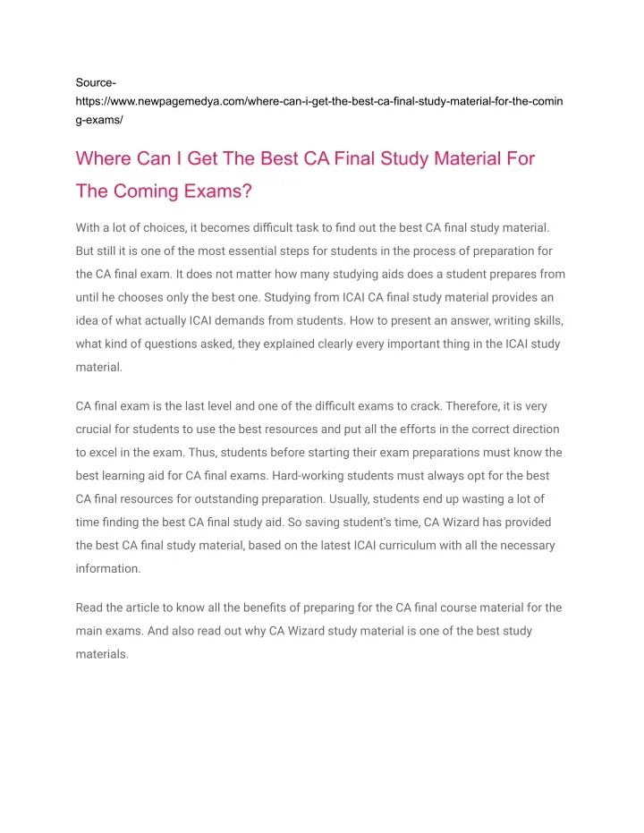 Source- https://www.newpagemedya.com/where-can-i-get-the-best-ca-final-study-material-for-the-comin g-exams/ Where Can I Get The Best CA Final Study Material For The Coming Exams? With a lot of choices, it becomes difficult task to find out the best CA final study material. But still it is one of the most essential steps for students in the process of preparation for the CA final exam. It does not matter how many studying aids does a student prepares from until he chooses only the best one. Studying from ICAI CA final study material provides an idea of what actually ICAI demands from students. How to present an answer, writing skills, what kind of questions asked, they explained clearly every important thing in the ICAI study material. CA final exam is the last level and one of the difficult exams to crack. Therefore, it is very crucial for students to use the best resources and put all the efforts in the correct direction to excel in the exam. Thus, students before starting their exam preparations must know the best learning aid for CA final exams. Hard-working students must always opt for the best CA final resources for outstanding preparation. Usually, students end up wasting a lot of time finding the best CA final study aid. So saving student’s time, CA Wizard has provided the best CA final study material, based on the latest ICAI curriculum with all the necessary information. Read the article to know all the benefits of preparing for the CA final course material for the main exams. And also read out why CA Wizard study material is one of the best study materials.