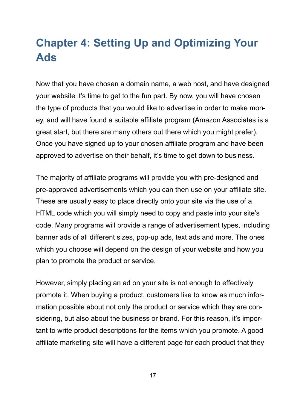 Chapter 4: Setting Up and Optimizing Your Ads Now that you have chosen a domain name, a web host, and have designed your website it’s time to get to the fun part. By now, you will have chosen the type of products that you would like to advertise in order to make mon- ey, and will have found a suitable affiliate program (Amazon Associates is a great start, but there are many others out there which you might prefer). Once you have signed up to your chosen affiliate program and have been approved to advertise on their behalf, it’s time to get down to business. The majority of affiliate programs will provide you with pre-designed and pre-approved advertisements which you can then use on your affiliate site. These are usually easy to place directly onto your site via the use of a HTML code which you will simply need to copy and paste into your site’s code. Many programs will provide a range of advertisement types, including banner ads of all different sizes, pop-up ads, text ads and more. The ones which you choose will depend on the design of your website and how you plan to promote the product or service. However, simply placing an ad on your site is not enough to effectively promote it. When buying a product, customers like to know as much infor- mation possible about not only the product or service which they are con- sidering, but also about the business or brand. For this reason, it’s impor- tant to write product descriptions for the items which you promote. A good affiliate marketing site will have a different page for each product that they ?17