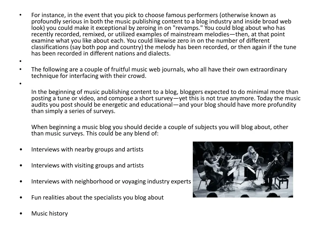 For instance, in the event that you pick to choose famous performers (otherwise known as profoundly serious in both the music publishing content to a blog industry and inside broad web look) you could make it exceptional by zeroing in on "revamps." You could blog about who has recently recorded, remixed, or utilized examples of mainstream melodies—then, at that point examine what you like about each. You could likewise zero in on the number of different classifications (say both pop and country) the melody has been recorded, or then again if the tune has been recorded in different nations and dialects. • The following are a couple of fruitful music web journals, who all have their own extraordinary technique for interfacing with their crowd. In the beginning of music publishing content to a blog, bloggers expected to do minimal more than posting a tune or video, and compose a short survey—yet this is not true anymore. Today the music audits you post should be energetic and educational—and your blog should have more profundity than simply a series of surveys. When beginning a music blog you should decide a couple of subjects you will blog about, other than music surveys. This could be any blend of: • Interviews with nearby groups and artists • Interviews with visiting groups and artists • Interviews with neighborhood or voyaging industry experts • Fun realities about the specialists you blog about • Music history