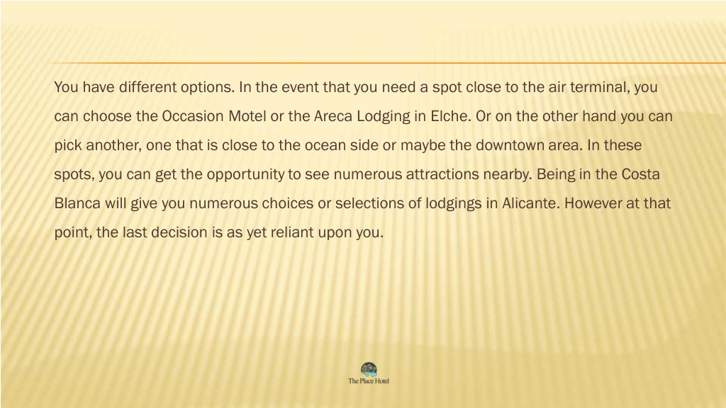 You have different options. In the event that you need a spot close to the air terminal, you can choose the Occasion Motel or the Areca Lodging in Elche. Or on the other hand you can pick another, one that is close to the ocean side or maybe the downtown area. In these spots, you can get the opportunity to see numerous attractions nearby. Being in the Costa Blanca will give you numerous choices or selections of lodgings in Alicante. However at that point, the last decision is as yet reliant upon you.