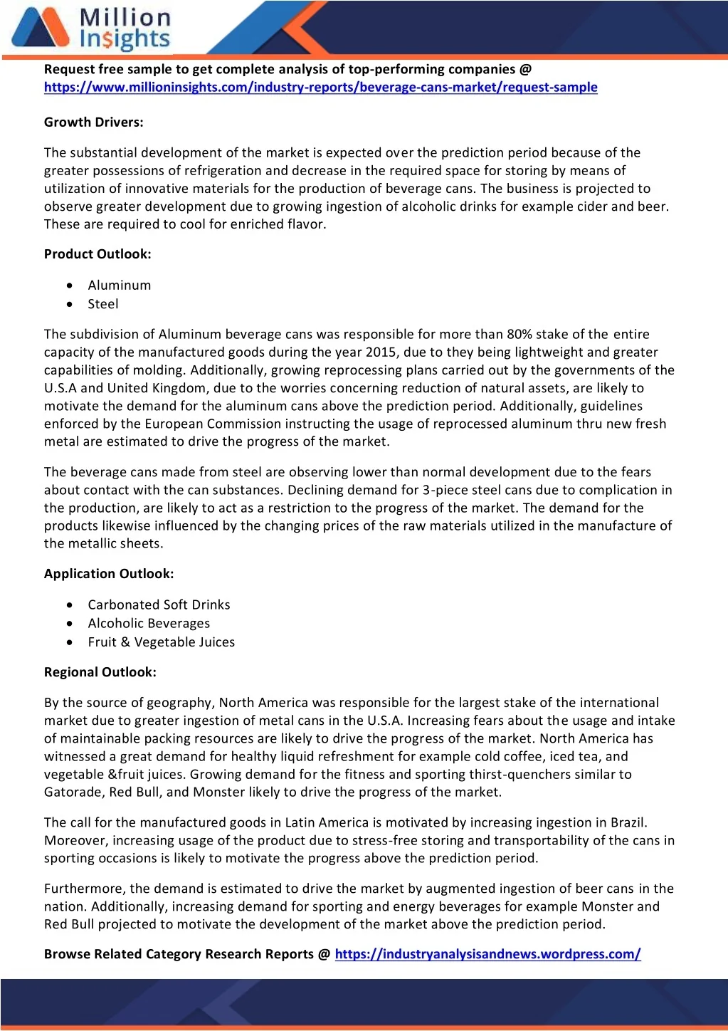 https://www.millioninsights.com/industry-reports/beverage-cans-market/request-samplehttps://www.millioninsights.com/industry-reports/beverage-cans-market/request-sample Growth Drivers: Request free sample to get complete analysis of top-performing companies @ The substantial development of the market is expected over the prediction period because of the greater possessions of refrigeration and decrease in the required space for storing by means of utilization of innovative materials for the production of beverage cans. The business is projected to observe greater development due to growing ingestion of alcoholic drinks for example cider and beer. These are required to cool for enriched flavor. Product Outlook: Aluminum Steel The subdivision of Aluminum beverage cans was responsible for more than 80% stake of the entire capacity of the manufactured goods during the year 2015, due to they being lightweight and greater capabilities of molding. Additionally, growing reprocessing plans carried out by the governments of the U.S.A and United Kingdom, due to the worries concerning reduction of natural assets, are likely to motivate the demand for the aluminum cans above the prediction period. Additionally, guidelines enforced by the European Commission instructing the usage of reprocessed aluminum thru new fresh metal are estimated to drive the progress of the market. The beverage cans made from steel are observing lower than normal development due to the fears about contact with the can substances. Declining demand for 3-piece steel cans due to complication in the production, are likely to act as a restriction to the progress of the market. The demand for the products likewise influenced by the changing prices of the raw materials utilized in the manufacture of the metallic sheets. Application Outlook: Carbonated Soft Drinks Alcoholic Beverages Fruit & Vegetable Juices Regional Outlook: By the source of geography, North America was responsible for the largest stake of the international market due to greater ingestion of metal cans in the U.S.A. Increasing fears about the usage and intake of maintainable packing resources are likely to drive the progress of the market. North America has witnessed a great demand for healthy liquid refreshment for example cold coffee, iced tea, and vegetable &fruit juices. Growing demand for the fitness and sporting thirst-quenchers similar to Gatorade, Red Bull, and Monster likely to drive the progress of the market. The call for the manufactured goods in Latin America is motivated by increasing ingestion in Brazil. Moreover, increasing usage of the product due to stress-free storing and transportability of the cans in sporting occasions is likely to motivate the progress above the prediction period. Furthermore, the demand is estimated to drive the market by augmented ingestion of beer cans in the nation. Additionally, increasing demand for sporting and energy beverages for example Monster and Red Bull projected to motivate the development of the market above the prediction period. Browse Related Category Research Reports @ https://industryanalysisandnews.wordpress.com/