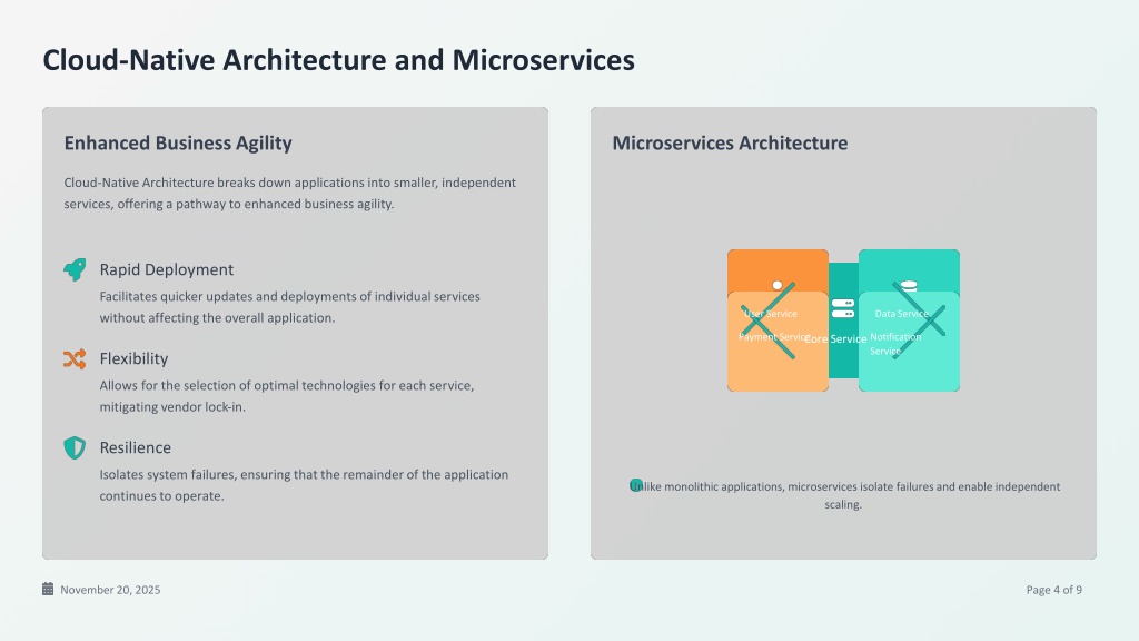 Cloud-Native Architecture and Microservices Enhanced Business Agility Microservices Architecture Cloud-Native Architecture breaks down applications into smaller, independent services, offering a pathway to enhanced business agility. Rapid Deployment Facilitates quicker updates and deployments of individual services without affecting the overall application. User Service Data Service Payment Service Core Service Notification Service Flexibility Allows for the selection of optimal technologies for each service, mitigating vendor lock-in. Resilience Isolates system failures, ensuring that the remainder of the application continues to operate. Unlike monolithic applications, microservices isolate failures and enable independent scaling. November 20, 2025 Page 4 of 9