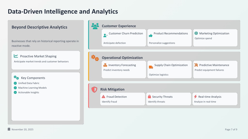 Data-Driven Intelligence and Analytics Customer Experience Beyond Descriptive Analytics Customer Churn Prediction Product Recommendations Marketing Optimization Optimize spend Businesses that rely on historical reporting operate in reactive mode. Anticipate defection Personalize suggestions Proactive Market Shaping Operational Optimization Anticipate market trends and customer behaviors Inventory Forecasting Supply Chain Optimization Predictive Maintenance Predict inventory needs Predict equipment failures Optimize logistics Key Components Unified Data Fabric Machine Learning Models Risk Mitigation Actionable Insights Fraud Detection Security Threats Real-time Analysis Identify fraud Identify threats Analyze in real-time November 20, 2025 Page 7 of 9