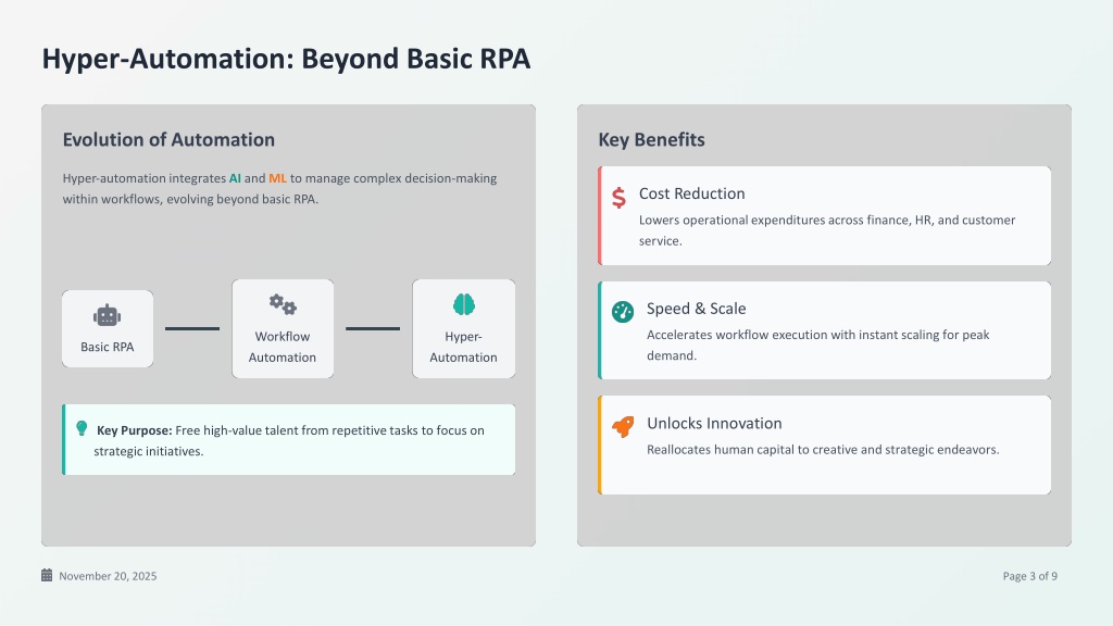 Hyper-Automation: Beyond Basic RPA Evolution of Automation Key Benefits Hyper-automation integrates AI and ML to manage complex decision-making within workflows, evolving beyond basic RPA. Cost Reduction Lowers operational expenditures across finance, HR, and customer service. Speed & Scale Accelerates workflow execution with instant scaling for peak demand. Workflow Automation Hyper-Automation Basic RPA Unlocks Innovation Key Purpose: Free high-value talent from repetitive tasks to focus on strategic initiatives. Reallocates human capital to creative and strategic endeavors. November 20, 2025 Page 3 of 9